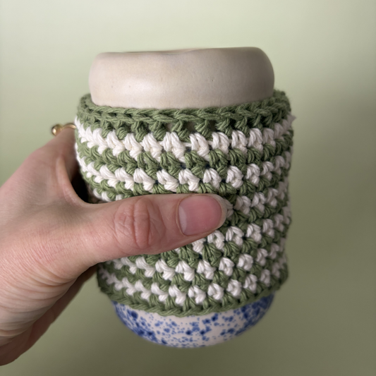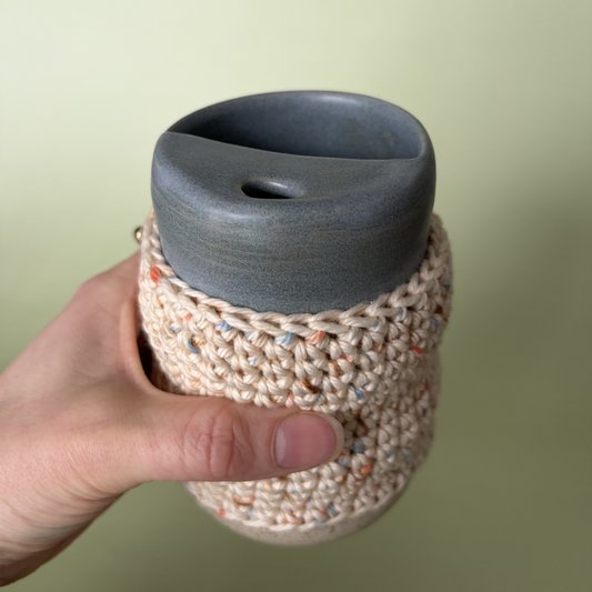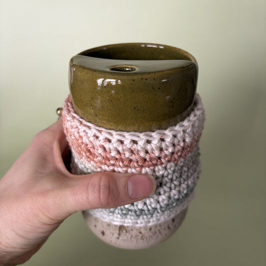 The perfect cozy layer for your to-go cup. Slip it on to keep your hands comfortable while you enjoy your favorite hot drinks. Crocheted by hand for a soft, snug fit. Every sleeve is handmade by Taylor Wilson.