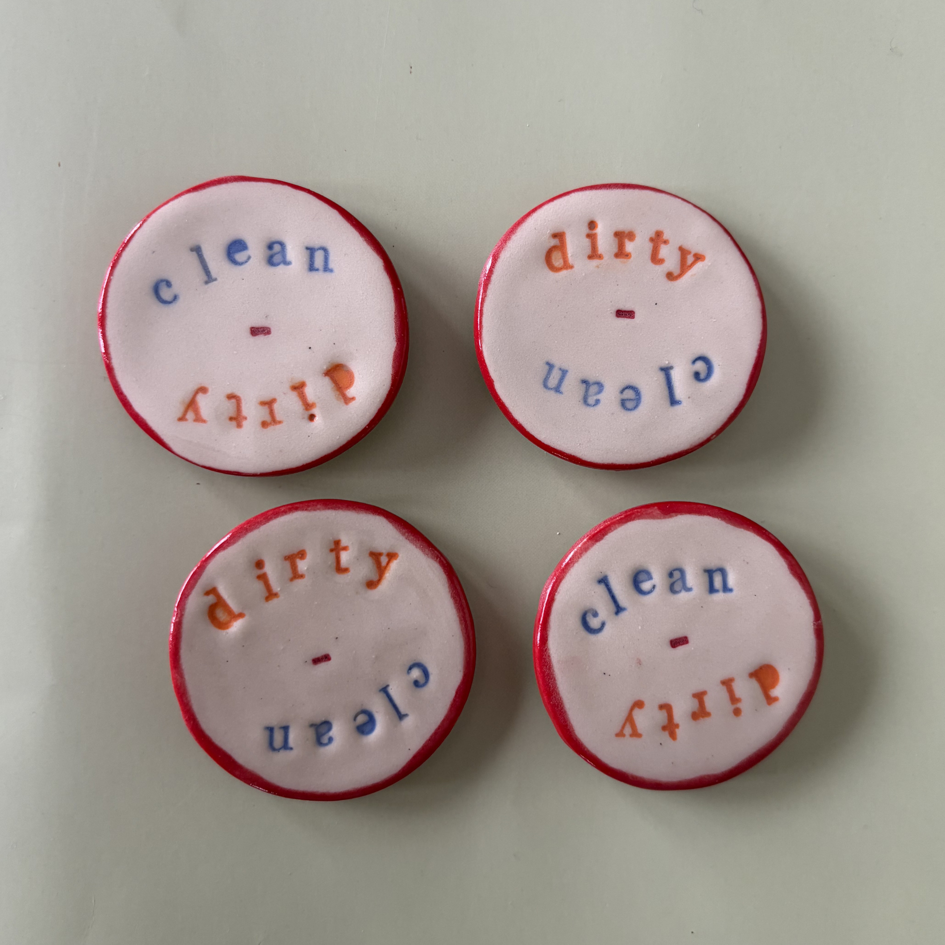 A charming handmade magnet to keep your kitchen running smoothly. Use the clean side to indicate the dish cycle has ran, then flip it to dirty as you load it.